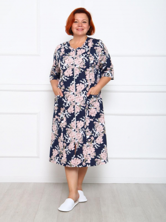 Прямой свободный крой позволяет скрыть недостатки фигуры и ощущать легкость во время домашнего отдыха. Халат домашний дополнен накладными карманами и стильной круглой горловиной.