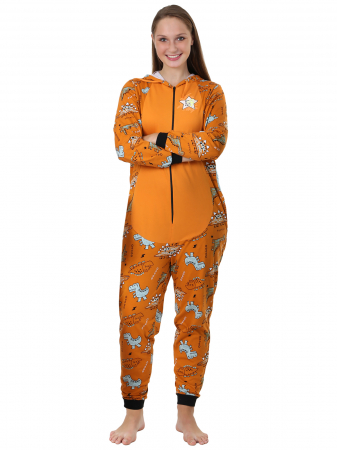 Комбинезон женский на молнии, с капюшоном, стилизованный в виде животного - динозавра (тираннозавра), двумя боковыми карманами в швах. Втачные рукава и низ изделия на манжетах, на полочке вставка с принтом, имитирующая манишку. На капюшоне принт, шнурок. Манишка, хвостик, передняя часть капюшона, ушки и манжеты и шнурок выполнены из отделочного гладкокрашеного полотна. Манжеты из отделочной рибаны.