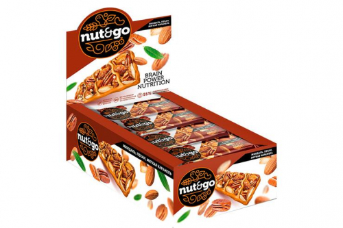 Состав продукта: ядра миндаля обжаренные, орех пекан сырой очищенный, глюкозные сиропы, сахар, масла растительные, мальтодекстрин (содержит консервант- диоксид серы); мука рисовая, сыворотка молочная сухая деминерализованная, влагоудерживающий агент- сорбитовый сироп; какао-порошок, соль, мука пшеничная, эмульгаторы- лецитины (рапсовый, соевый), сорбитан тристеарат, Е476; ароматизаторы. Возможно наличие арахиса и продуктов его переработки. Внимание! Продукт может содержать фрагменты скорлупы орехов.