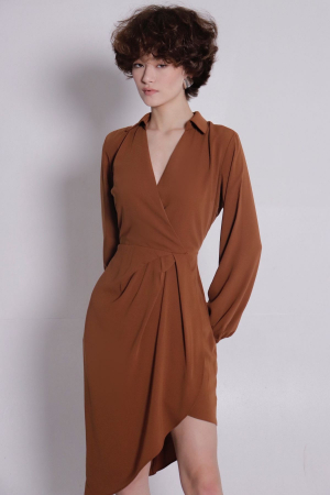 Платье отрезное по линии талии, лиф с запахом имеет глубокий V-образный вырез горловины, дополненный воротником. Рукава втачные, длинные, с узкими манжетами на пуговицах. Юбка силуэта "тюльпан" с запахом и драпировкой и асимметричной линией низа.