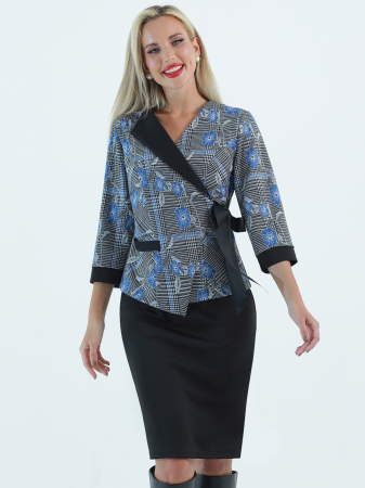 V-образный вырез горловины и рукава длиной три четверти придают костюму элегантный и женственный вид, а завязки на талии позволяют регулировать плотность облегания и создавать разные образы. Этот костюм станет отличным выбором для деловых встреч, рабочих будней или вечерних выходов.