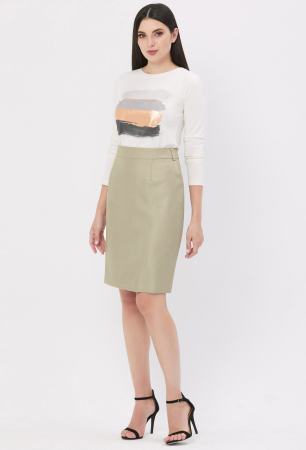 У юбки передняя половина с косыми карманами, в среднем шве задней половины юбки обработаны потайная молния и шлица. На подкладке .