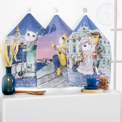 Приглашаем в путешествие по улицам Санкт-Петербурга! Наши сувенирные полотенца из рогожки украшены невероятными видами любимого города. Вот живописная набережная, по которой на самокате стремительно катится юная леди. А вот величественный Зимний дворец, у которого гуляют наши питерские коты. А чуть дальше красивые крыши, на которых сидят голуби и играют романтики-котики.