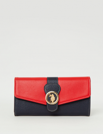 Our MEDALLION LARGE FLAP WALLET glistens with a luxurious goldtone medallion logo in the center, secured by a snap closure. This wallet also boasts a back exterior zippered pocket, complete with a branded zipper pull, as well as two large compartments and six credit card slots in the interior.