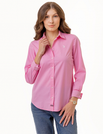 Our SOLID STRETCH POPLIN SHIRT is an absolute essential. This timeless style showcases a full front closure with buttons and a spread collar with eye catching inner beauty. It also boasts long sleeves with button cuffs, a straight hem design, and a delicate embroidered logo adorning the upper left front. Model wears size small.