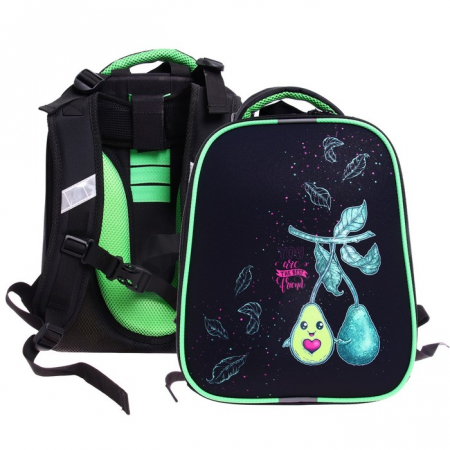 Ранец изготовлен из формованного EVA-материала и высокопрочного непромокаемого полиэстера. Размер 30 х 38 х 16 см. Вес 900 г. Прочные формованные стенки и дно ранца позволяют надежно защитить содержимое от влаги, загрязнений и предотвращают его замятие. Ранец с двумя вместительными отделениями, закрывающимися на реверсивную пластиковую молнию с металлическими «бегунками»; в первом — «плавающие» перегородки для тетрадей и учебников, во втором – большой карман из сетки и карманы-органайзеры для канцелярских принадлежностей. Плотная спинка с анатомическими элементами дополнительно укреплена пластиком, сверху – дышащая трехслойная сетка. Лямки-маечка плотные, мягкие. Регулируются по длине и высоте, что позволяет без труда отрегулировать их по росту ребенка. Ранец снабжен надежным нагрудным фиксатором. Есть удобная мягкая ручка для переноски и дополнительная петлевая ручка для размещения ранца на крюке. На дне ранца есть две пластиковые ножки. В соответствии с требованиями к безопасности на дороге, ранец имеет светоотражающие элементы на лямках и корпусе.