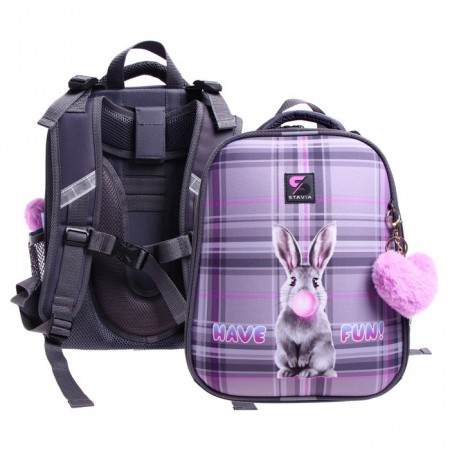 Ранец изготовлен из формованного EVA-материала и высокопрочного непромокаемого полиэстера. Размер 30 х 38 х 16 см. Вес 900 г. Прочные формованные стенки и дно ранца позволяют надежно защитить содержимое от влаги, загрязнений и предотвращают его замятие. Ранец с двумя вместительными отделениями, закрывающимися на реверсивную пластиковую молнию с металлическими «бегунками»; в первом — «плавающие» перегородки для тетрадей и учебников, во втором – большой карман из сетки и карманы-органайзеры для канцелярских принадлежностей. Плотная спинка с анатомическими элементами дополнительно укреплена пластиком, сверху – дышащая трехслойная сетка. Лямки-маечка плотные, мягкие. Регулируются по длине и высоте, что позволяет без труда отрегулировать их по росту ребенка. Ранец снабжен надежным нагрудным фиксатором. Есть удобная мягкая ручка для переноски и дополнительная петлевая ручка для размещения ранца на крюке. На дне ранца есть две пластиковые ножки. В соответствии с требованиями к безопасности на дороге, ранец имеет светоотражающие элементы на лямках и корпусе.