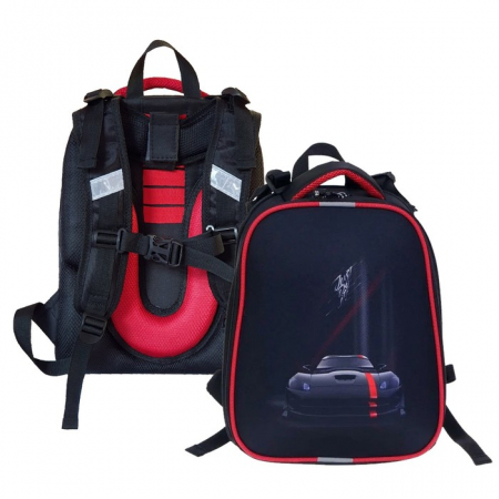 Ранец изготовлен из формованного EVA-материала и высокопрочного непромокаемого полиэстера. Размер 30 х 38 х 16 см. Вес 900 г. Прочные формованные стенки и дно ранца позволяют надежно защитить содержимое от влаги, загрязнений и предотвращают его замятие. Ранец с двумя вместительными отделениями, закрывающимися на реверсивную пластиковую молнию с металлическими «бегунками»; в первом — «плавающие» перегородки для тетрадей и учебников, во втором – большой карман из сетки и карманы-органайзеры для канцелярских принадлежностей. Плотная спинка с анатомическими элементами дополнительно укреплена пластиком, сверху – дышащая трехслойная сетка. Лямки-маечка плотные, мягкие. Регулируются по длине и высоте, что позволяет без труда отрегулировать их по росту ребенка. Ранец снабжен надежным нагрудным фиксатором. Есть удобная мягкая ручка для переноски и дополнительная петлевая ручка для размещения ранца на крюке. На дне ранца есть две пластиковые ножки. В соответствии с требованиями к безопасности на дороге, ранец имеет светоотражающие элементы на лямках и корпусе.