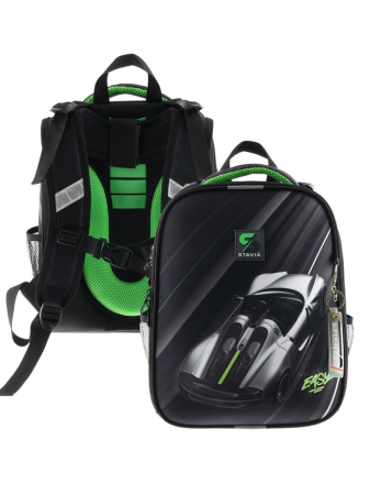 Ранец изготовлен из формованного EVA-материала и высокопрочного непромокаемого полиэстера. Размер 30 х 38 х 16 см. Вес 900 г. Прочные формованные стенки и дно ранца позволяют надежно защитить содержимое от влаги, загрязнений и предотвращают его замятие. Ранец с двумя вместительными отделениями, закрывающимися на реверсивную пластиковую молнию с металлическими «бегунками»; в первом — «плавающие» перегородки для тетрадей и учебников, во втором – большой карман из сетки и карманы-органайзеры для канцелярских принадлежностей