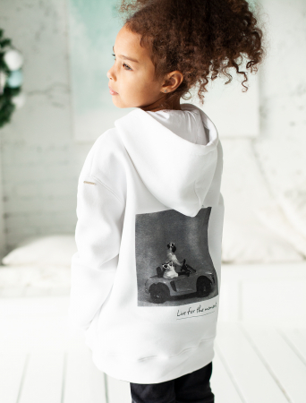 Худи выполнено из футера-трехнитки. Теплая модель с начесом дополнена забавным фотопринтом на спинке и надписью: «Живи в моменте» и «Живи, смейся, люби». Гармонично сочетается в костюме с брюками F44.064