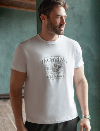 Перевод принта: Eastern route yachting, sailing racing challenge, east coast 1982, yacht club, offshore trans atlantic regatta, ocean race, round the world - заплыв на яхте по восточному маршруту, соревнование мореплавателей, яхт-клуб, трансатлантическая регата, гонка вокруг света. Футболка выполнена из премиального хлопка с эластаном. Авторский принт нанесен фактурными красками с устойчивым покрытием. Изделие комфортно сидит по фигуре, не сковывая движений. За счет среднего объема, хорошо подойдет как первый слой под пиджак, кардиган или бомбер. На рукаве нашивка из эко-кожи с логотипом бренда.