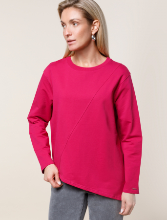 Ассиметричный джемпер выполнен из премиального футера двухнитки. Спущенная линия плеча поддерживает расслабленный образ, который особенно хорошо будет сочетаться в костюме с брюками D44.122, D44.123 и D44.128. Наличие эластана в составе изделия гарантирует идеальную посадку и комфорт.
