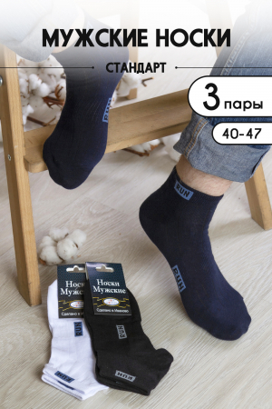 Набор мужских носков средней длины. По верху носка вывязаны полосы, надпись на резинке и сбоку.