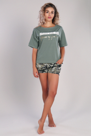 Яркий молодежный комплект в стиле Милитари из футболки и шорт. Футболка с втачным рукавом и декоративной глянцевой печатью в стиле шелкографии с добавлением глитерра. Свободные шорты на резинке с карманами.