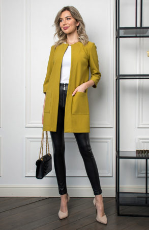 Кардиган прямого силуэта выполнен из трикотажной ткани. На полочке нагрудные вытачки и накладные карманы. Вырез горловины круглый не глубокий. Рукав длиной 3/4 втачной.