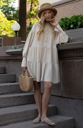 Кокткейльное клешеное платье с декором из хлопкового кружева. Силуэт платья трапеция, достигнут благодаря воланам. Спереди платье на пуговицах. По горловине небольшая стойка. Рукав втачной, длинный, снизу с широким манжетом. Длина платья выше колена.