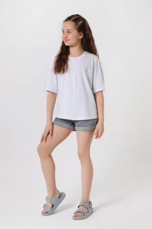 Футболка для девочек модной объемно-силуэтной формы, с вертикальным отстроченным швом по центру переда. На рукавах также выполнены декоративные вертикальные отстроченные швы и глубокие защипы по низу.