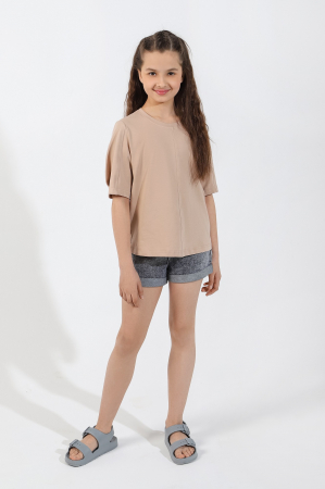 Футболка для девочек модной объемно-силуэтной формы, с вертикальным отстроченным швом по центру переда. На рукавах также выполнены декоративные вертикальные отстроченные швы и глубокие защипы по низу.