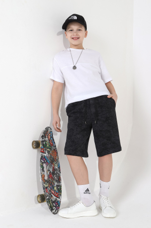 Шортыдля мальчика из трикотажного полотна "футер-трехника -петля", на притчном поясе с эластичной тесьмой внутри, с карманами в боковых швах и имитацией застежки "гульфик". В центре пояса - две обметанные петли, чере которые продет шнурок с наконечниками для регулирования степени прилегания шорт по талии.