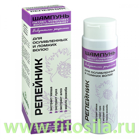 Лопух большой или репейник (Arctium lappa) издревле использовался для лечения и укрепления волос. Репейное масло стимулировало рост, а отвар корня лопуха придавал волосам блеск и красоту, уменьшал их ломкость. В состав шампуня также включены экстракты хвоща, лука, алоэ и масло жожоба. В комплексе эти лекарственные растения эффективно укрепляют, стимулируют рост волос, возвращают им природный блеск и упругость.