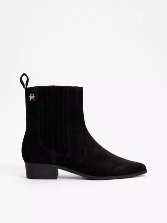Tommy Hilfiger women's boot. The Chelsea-inspired lines of these suede cowboy boots create a refined look, complemented by polished TH Monogram accents for luxe detailing.