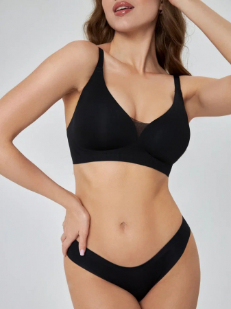 Бесшовный бюстгальтер без косточек с мягкими латексными чашечками с перфорацией. Данная модель выполнена с глубоким вырезом, который прикрыт дышащей сеточкой – создает более сложный и утонченный образ не жертвуя удобством. Мягкие бретели регулируются по высоте. Съемные облегченные латексные чашечки выполнены без пуш-ап эффекта.