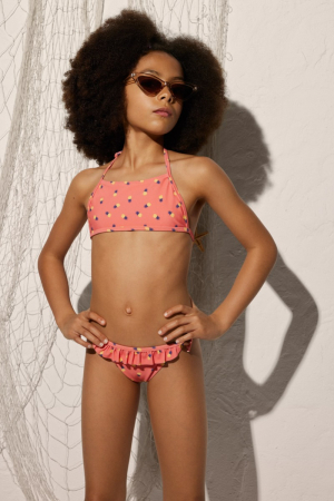 Раздельный купальник для девочек. Застежка на спине, регулируемая бретель через шею, трусики на завязках по бокам.