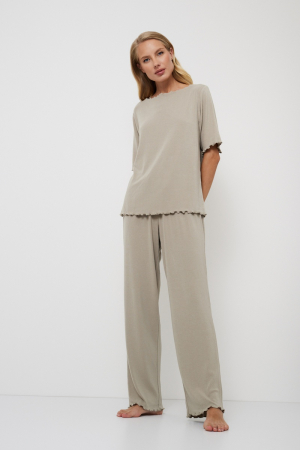 Представляем комплект Callie set long, в котором комфорт сочетается с непринужденным стилем! Погрузитесь в атмосферу расслабления с этим ансамблем из вискозы в рубчик однотонного серо-бежевого цвета, созданным для того, чтобы вы чувствовали себя уютно и шикарно. Топ с рукавами до локтя может похвастаться восхитительным эффектом складок на воротнике и рукавах. Брюки свободного кроя с удобным поясом и с регулируемой завязкой на поясе обеспечивают непринужденный крой. Комплект Callie set long идеально подходит для того, чтобы отдыхать и наслаждаться неторопливыми моментами. Это ваш выбор для максимального комфорта и непринужденной элегантности.