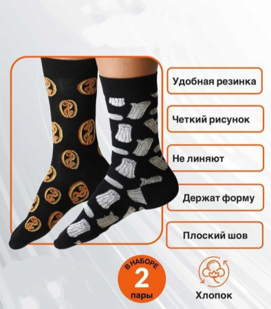 Носки цветные унисекс. Размер 39-42 универсальный Состав: 77% хлопок 15% полиэстер 5% эластан. Цвета (принт/цвет): доллар/черный, дрова/черный. В упаковке 2 пары (состав упаковки на фото) . Минимальный заказ 1 упаковка.