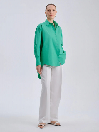 Удлинённый силуэт с округлённым низом делает рубашку универсальной — её можно носить как навыпуск, так и заправленной. Чистый, свежий цвет делает эту модель акцентным элементом в повседневном или деловом образе. Отлично сочетается как с базовыми брюками, так и с денимом, создавая современные и уверенные луки.