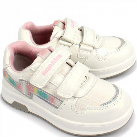 Модель выполнена из экокожи белого цвета и удобно фиксируется на липучки. Подкладка из натурального хлопка и кожаная стелька подарят комфорт детским ножкам во время носки.