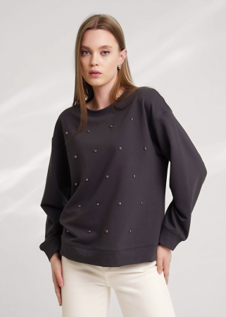 Джемпер из трикотажного полотна футер с начесом, свободного силуэта. Округлая горловина с обтачкой. Длинный рукав со спущенной линией плеча. По низу рукава и изделия манжеты. Спереди пробивные бусины.
