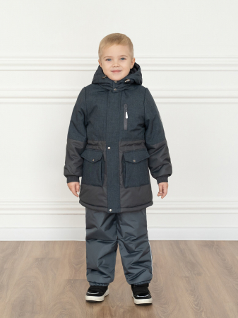 Детская зимняя мембранная удлиненная куртка цвета графит комбинированная. Несъемный глубокий капюшон с застежкой на кнопках, со светоотражающими полосами сзади. Для регулировки взята резинкой с фиксаторами. Высокий воротник. Застегивается на молнию. Внутренняя и внешняя ветрозащитная планка с кнопками. Защитный клапан для бегунка молнии. Один нагрудный каhман на молнии. Два накладных кармана с клапанами снизу. По талии внутренняя кулиска для уменьшения объема с фиксаторами. Подклад до половины основной части и в капюшоне - мягкий флис. Нижняя часть и рукава подкладка из таффеты. По низу рукавов манжеты-резинки. По верху одного из рукавов светоотражающая нашивка.