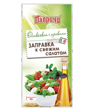 Заправка «Оливковая с травами» - образец итальянской кухни. Рецептура заправки создавалась с учетом лучших традиций итальянской кулинарной школы. В состав салатной заправки входит виноградный уксус, сок лимона и пряности, включая, базилик, петрушку, лук, чеснок.