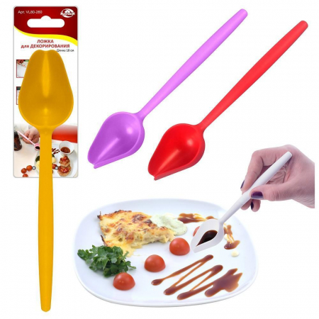 Оформляйте блюда и выпечку с использованием ложки для декорирования! Подходит для работы с соусами, шоколадом, глазурью, карамелью, сиропами. Край ложки выполнен в форме воронки, что позволяет контролировать толщину струи. Используя этот инструмент, вы сможете нарисовать линии разной формы, сделать изящные капли и нанести другие рисунки на тарелку или непосредственно на выпечку или готовую еду. Эта удобная ложка для декорирования станет оригинальным подарком для тех, кто любит не только вкусно готовить, но и красиво оформлять блюда. Изготовлено из пластмассы (полипропилен). Допускается мытье в посудомоечной машине.