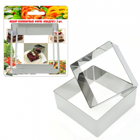 Еще один способ проявить творчество в сервировке — использовать набор кулинарных форм «Квадрат». Эти приспособления подойдут для оформления слоеных блюд, выкладки салатов, оформления бутербродов или пирожных. Формы изготовлены из нержавеющей стали, соответственно, в них можно тушить или жарить. Также это отличный способ приготовить необычную яичницу или омлет. В наборе 2 формы, размерами 8х8х4 см и 10х10х4 см. Оформляйте праздничные и повседневные блюда, радуйте родных и гостей. После использования промойте губкой с жидкими моющими средствами, храните изделие в сухом помещении.