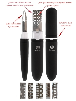 Профессиональный срезающий инструмент для кожи, валиков и кутикулы.Состоит из трех разных рабочих поверхностей. Лезвие съёмное. Нужно обязательно, после работы с триммером обрабатывать его в мыльном растворе и дезинфецировать при помощи хлоргексидина или мирамистина. Две поверхности, с 26 круглыми отверстиями с каждой. Предназначены для удаления утолщений кожи путем среза. натоптышей на пятке или в области большого пальца. Движениями вперед-назад удаляется лишняя кожа. По бокам расположены полоски, размером 0.5 миллиметра. Это 16 лезвий, на расстоянии 0.5 миллиметра, друг от друга. Предназначены для удаления боковых и околоногтевых валиков. Не рекомендуется резко двигать вперед-назад. Рекомендуется одна проводка сбоку ногтя. На кончике инструмента расположено 8 лезвий, на расстоянии 1 мм друг от друга, загнутые под 30 градусным углом. Они предназначены для срезания кутикулы и удаления кожы из под ногтя. Сбоку есть широкое отверстие, которым можно срезать сухую кожу в области мозолей.