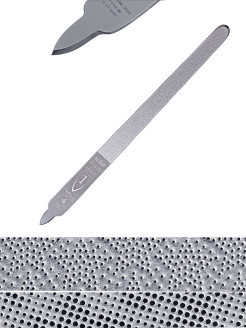 Лазерная пилка-полировка, предназначенная для коррекции ногтей и полировки. Пушер, предназначенный для отодвигания кутикулы и очистки пространства под ногтем, имеет две разные поверхности. Таким образом, переворачивая пушер мы можем дополнительно полировать ноготь при отодвигании.Пилочка также имеет две разные рабочие поверхности. Поверхность Medium (рисунок пупырышек в виде звезды) предназначена для опиливания ногтей, а также кутикулы и боковых валиков Ширина пупырышка 0,05мм. Поверхность Fine (черные жемчужинки) предназначена для полировки. Ею также можно спиливать, процесс будет более медленный, но более щадящий. Форма наконечника Arrow - язычок выглядит как наконечник стрелы, заточен с двух сторон образуя острую грань. Стрела нужна для скобления по ногтю, выравнивания каких-либо неровностей, отодвигания кутикулы. Стрела может легко отделять кожу, сформированную пушером в валик. Она будто бы заменяет ножницы.