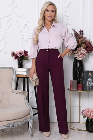Брюки из плотного хорошо держащего форму жаккардового трикотажного полотна с заутюженными стрелками.Брюки с высокой посадкой по талии застегивающиеся на молнию в гульфике.Пояс притачной с застежкой на пуговицу.Для удобства в носке пояс по спинке собран на резину.По бокам подрезные функциональные карманы.