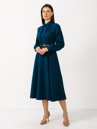 Платье из однотонной костюмной ткани. Воротник отложной на стойке и планкой. Рукав втачной, длинный на манжете со сборкой. Отрезное по линии талии. На лифе полочки декоративные отстроченные складки. Юбка - колокол. Застежка на петли и пуговицы. Пояс в комплект не входит . Рост модели 170 см. Изделие на модели 42 р-ра. Длина изделия по спинке 116,9 см.
