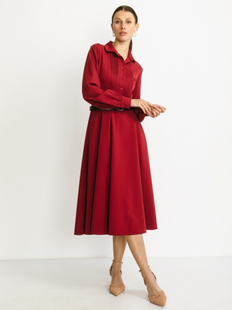 Платье из однотонной костюмной ткани. Воротник отложной на стойке и планкой. Рукав втачной, длинный на манжете со сборкой. Отрезное по линии талии. На лифе полочки декоративные отстроченные складки. Юбка - колокол. Застежка на петли и пуговицы. Пояс в комплект не входит . Рост модели 170 см. Изделие на модели 42 р-ра. Длина изделия по спинке 116,9 см.
