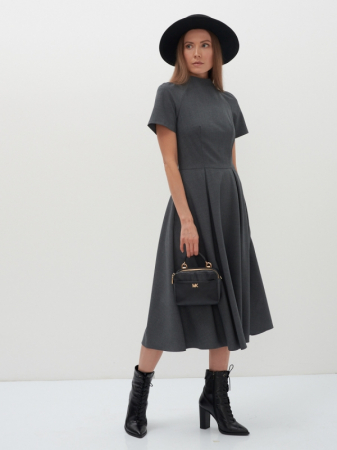 Платье из однотонной костюмной ткани. Х-силуэт. Цельнокроенный воротник-стойка. Рукав короткий-реглан. Отрезное по линии талии, юбка-колокол. Карманы в боковых швах. Застежка на потайную молнию по центру спинки. Рост модели 170 см. Изделие на модели 42 р-ра.