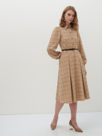 Платье из костюмной ткани в клетку. Рукав втачной, длинный на манжете, со сборкой по окату и низу. Рубашечный воротник на стойке и планке. Отрезное по линии талии, юбка со встречными складками. Карманы в боковых швах. В комплекте сьемный пояс. Застежка на петли и пуговицы по планке и манжету, потайная молния в боковом шве. Изделие на модели 42 р-ра. Длина изделия по спинке 111,9 см.