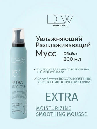 Увлажняющий разглаживающий мусс Дью дисциплинирует непослушные волосы, не утяжеляя их. Идеально подходит для пушистых, пористых и вьющихся волос.