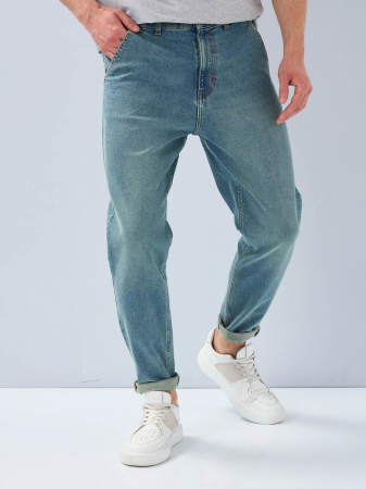 Мужские комфортные модные джинсы "Бананы" с пятью карманами.Для удобства боковые карманы джинсов сделаны косыми , т.е. карманы "хулиганы". Высокая талия, свободные по бедрам и бедру и узкие внизу. Застежка на молнии. Выполнены из классической ткани denim, Классическая средняя стирка "stone wash".Джинсы дополнительно чуть-чуть подкрашены в желтый цвет для получения эффекта "GET DIRTY", т.е. эффекта запачканных джинсов.