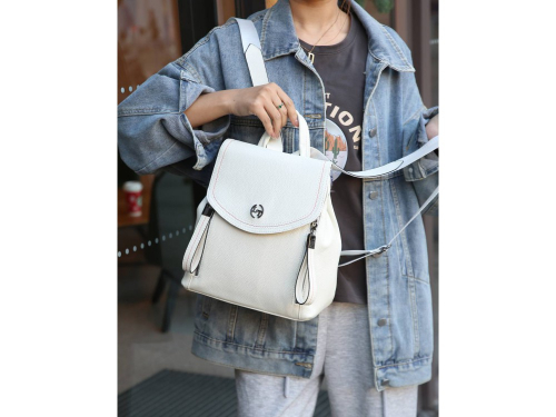 Короткая ручка + лямки рюкзака. Дополнительный текстильный ремень на плечо с возможностью новить как сумку. Внутри: одно основное отделение, карман для мелочей и дополнительный карман для аксессуаров на молнии. Снаружи: спереди два кармана на молнии. Сзади: карман для мелочей на молнии.