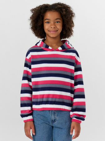 Укороченный анорак из флиса. Силуэт свободный, пройма спущена. Рукава длинные, втачные. Горловина круглой формы, втачан капюшон. По низу изделия и низу рукавов застрочена эластичная тесьма.
