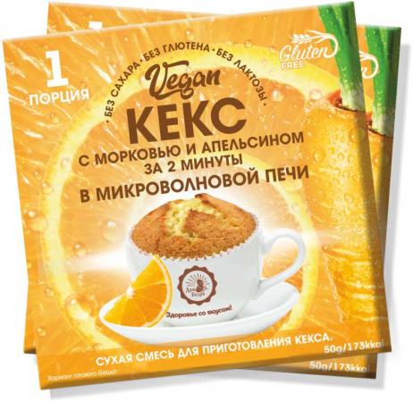 Кекс VEGAN "за 2 минуты" с морковью и апельсином – это 100% натуральный продукт для приготовления вкусного и полезного десерта всего за 2 минуты в обычной чашке, используя микроволновую печь. Этот кекс не содержит глютена, лактозы и сахара, ГМО, что делает его идеальным выбором для людей с пищевыми ограничениями, а также для тех, кто следит за своим здоровьем.
