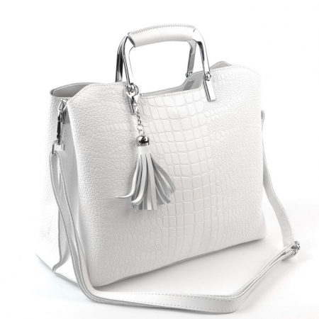 Женская сумка из натуральной кожи под крокодила белого цвета. Имеет металлические ручки, высотой 6 см., съемный брелок с кожаными кисточками и регулируемый, наплечный ремень, с максимальной длиной 120 см. Сумка закрывается на молнию. Внутри отделение, разделенное карманом на молнии по середине и боковые кармашки, два открытых и один на молнии. На дне сумки металлические ножки.