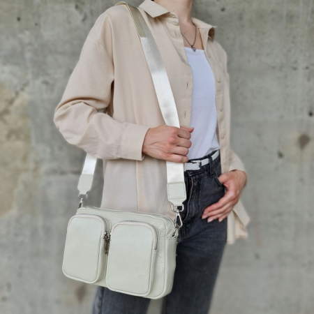 Женская сумка через плечо с объёмными, наружными карманами из натуральной глянцевой кожи кремового цвета.